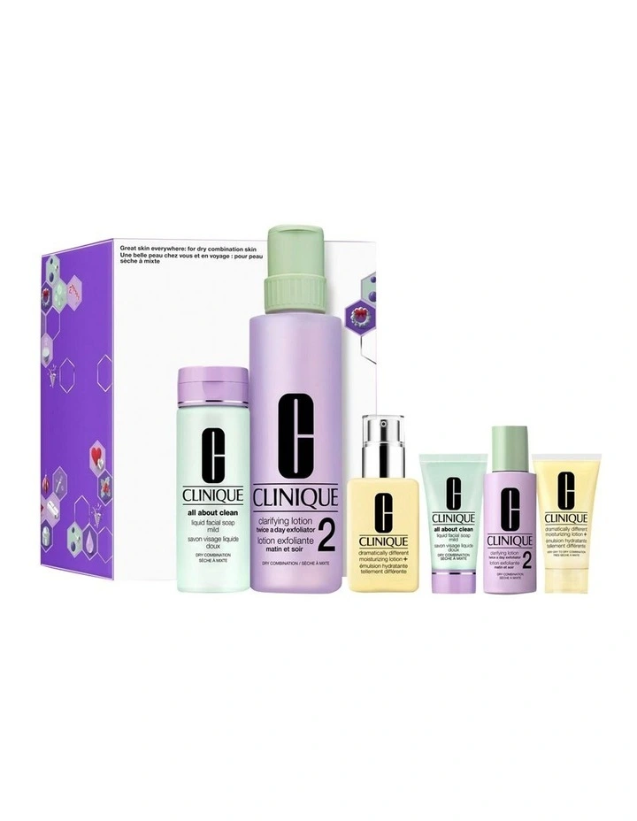 Our most-wanted holiday set. Cliniques three signature steps for glowing skinone set for home, one for travel. Customised for drier skin types. A $208 value.