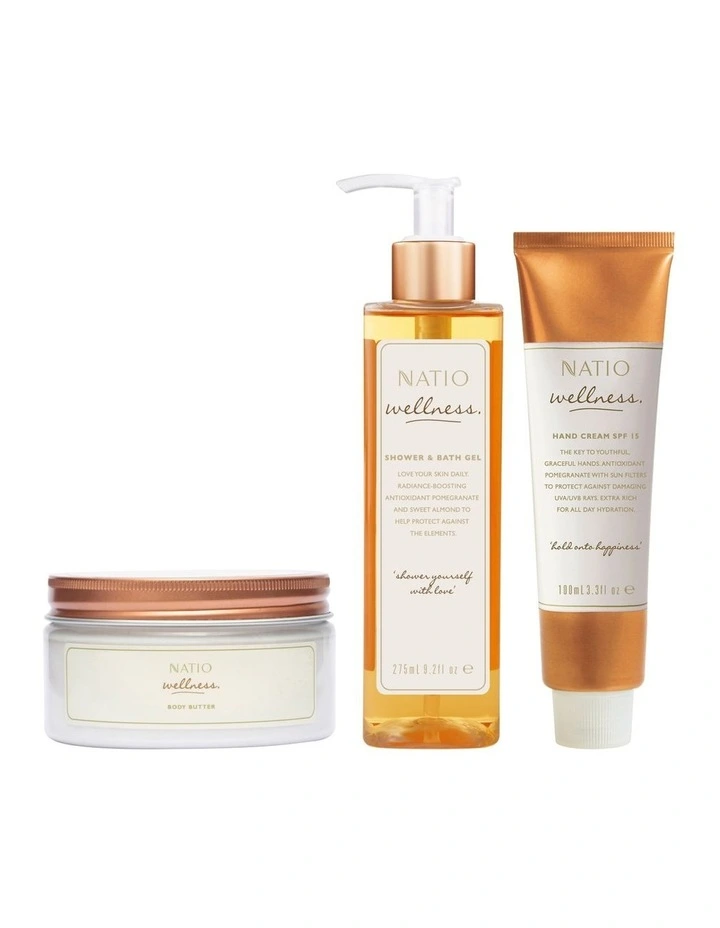 Natural Radiance gift set includes a Wellness Body Butter 240g, Shower & Bath Gel 275ml, Hand Cream SPF 15 100ml and complimentary dual body loofah, presented in a Natio cosmetic bag.Β Β Valued at $43.85.