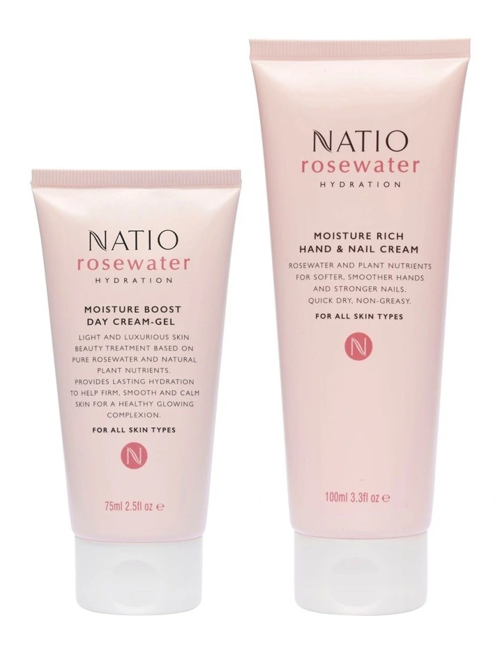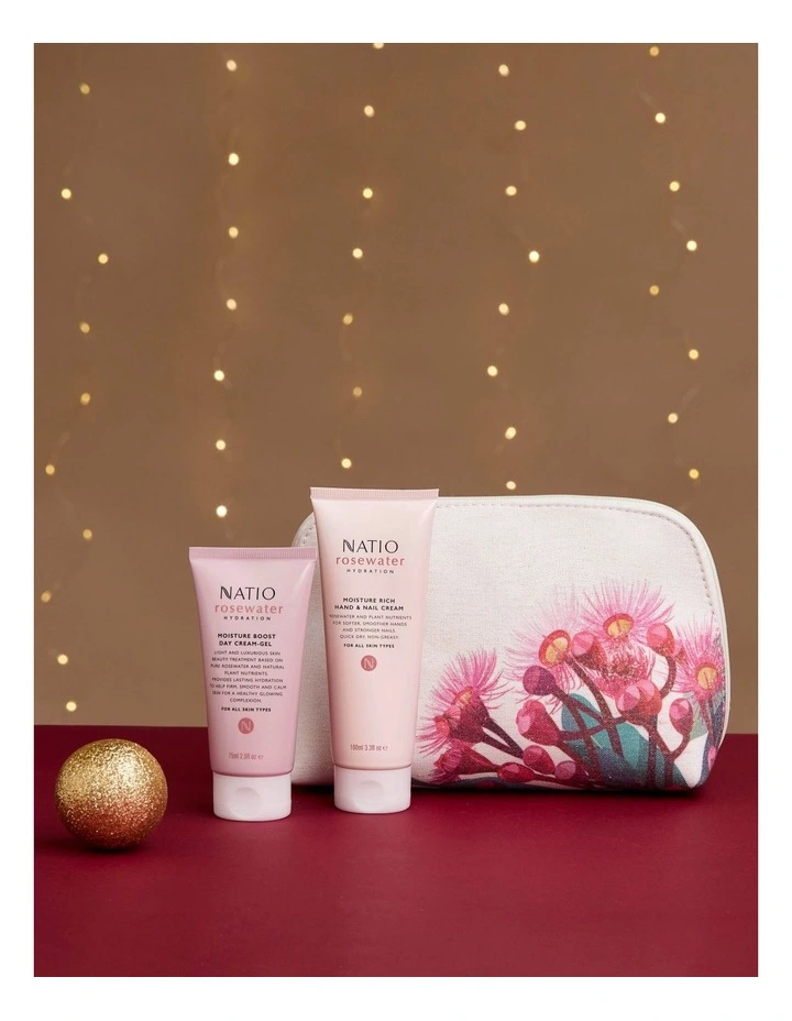 Precious Petals gift set contains a Rosewater Hydration Moisture Boost Day Cream-Gel 75ml and Moisture Rich Hand & Nail Cream 100ml, presented in a complimentary Natio Lamai Limited Edition cosmetic bag featuring native flora artwork by Australian digital artist, Lamai Anne.Β Β
