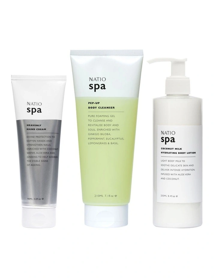 Ingredients: Heavenly Hand Cream 90ml Water (Aqua), Caprylic/Capric Triglyceride, Glyceryl Stearate, Cetearyl Alcohol, Dimethicone, Phenoxyethanol, Aloe Barbadensis Leaf Juice, Carbomer, Benzyl Alcohol, Glycerin, Disodium EDTA, Potassium Cetyl Phosphate, Cocos Nucifera (Coconut) Fruit Juice, Prunus Amygdalus Dulcis (Sweet Almond) Oil, Ethylhexyl Palmitate, Triethanolamine, Tocopheryl Acetate, Tapioca Starch, Citrus Limon (Lemon) Peel Oil, Panax Ginseng (Ginseng) Root Extract, Sesamum Indicum (Sesame) Seed Oil, Fragrance (Parfum). Pep-Up Body Cleanser 210ml Water (Aqua), Sodium Laureth Sulfate, Sodium Chloride, Cocamidopropyl Betaine, Cymbopogon Flexuosus Oil, Eucalyptus Dives Leaf Oil, Mentha Piperita (Peppermint) Oil, Ocimum Basilicum (Basil) Oil, Eucalyptus Species Leaf Oil, Mentha Piperita (Peppermint) Leaf Extract, Ginkgo Biloba Leaf Extract, Guar Hydroxypropyltrimonium Chloride, Glycerin, Propylene Glycol, Glycol Distearate, Ammonium Lauryl Sulfate, Laureth-4, Disodium EDTA, Citric Acid, Ethylhexylglycerin, Sodium Dehydroacetate, Benzyl Alcohol, Phenoxyethanol, Green 3 (CI 42053), Yellow 5 (CI 19140). Coconut Milk Hydrating Body Lotion 250ml Water (Aqua), Caprylic/Capric Triglyceride, Isopropyl Palmitate, Glycerin, Isostearic Acid, Aloe Barbadensis Leaf Juice, Cocos Nucifera (Coconut) Oil, Simmondsia Chinensis (Jojoba) Seed Oil, Potassium Cetyl Phosphate, Cetyl Alcohol, Cocos Nucifera (Coconut) Fruit Powder, Tocopheryl Acetate, Microcrystalline Cellulose, Triethanolamine, Acrylates/C10-30 Alkyl Acrylate Crosspolymer, Daucus Carota Sativa (Carrot) Seed Oil, Tetrasodium EDTA, Phenoxyethanol, Caprylyl Glycol, Propylene Glycol, BHA, Propyl Gallate, Citric Acid.Β