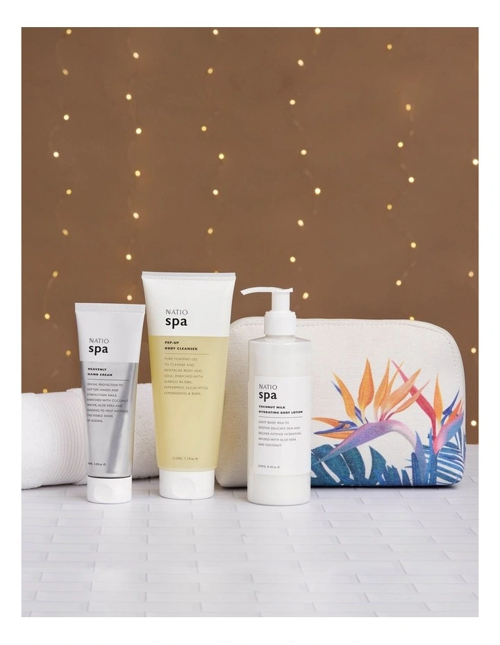 Quiet Cove gift set contains a Spa Heavenly Hand Cream 90ml, Pep-Up Body Cleanser 210ml and Coconut Milk Hydrating Body Lotion 250ml, presented in a complimentary Natio Lamai Limited Edition cosmetic bag featuring native flora artwork by Australian digital artist, Lamai Anne.Β Β