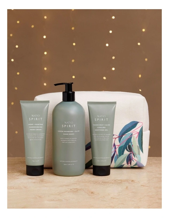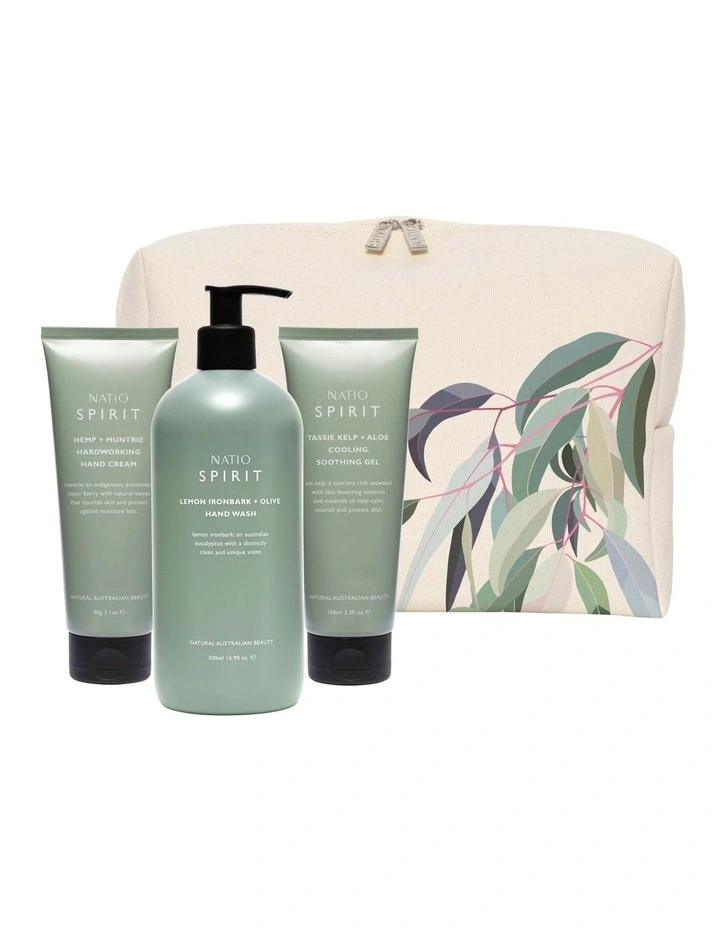 Whispering Gum gift set contains a Spirit Hemp Muntrie Hardworking Hand Cream 90g, Lemon Ironbark Olive Hand Wash 500ml and Tassie Kelp Aloe Cooling Soothing Gel 100ml, presented in a complimentary Natio Lamai Limited Edition cosmetic bag featuring native flora artwork by Australian digital artist, Lamai Anne.Β Β