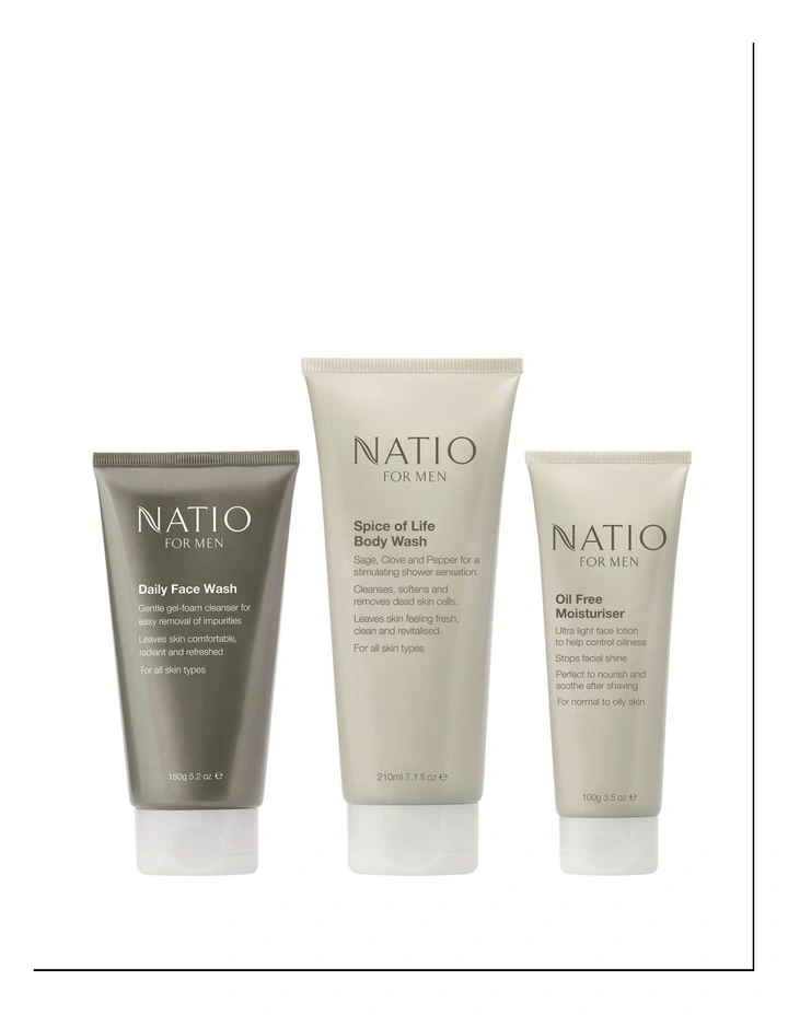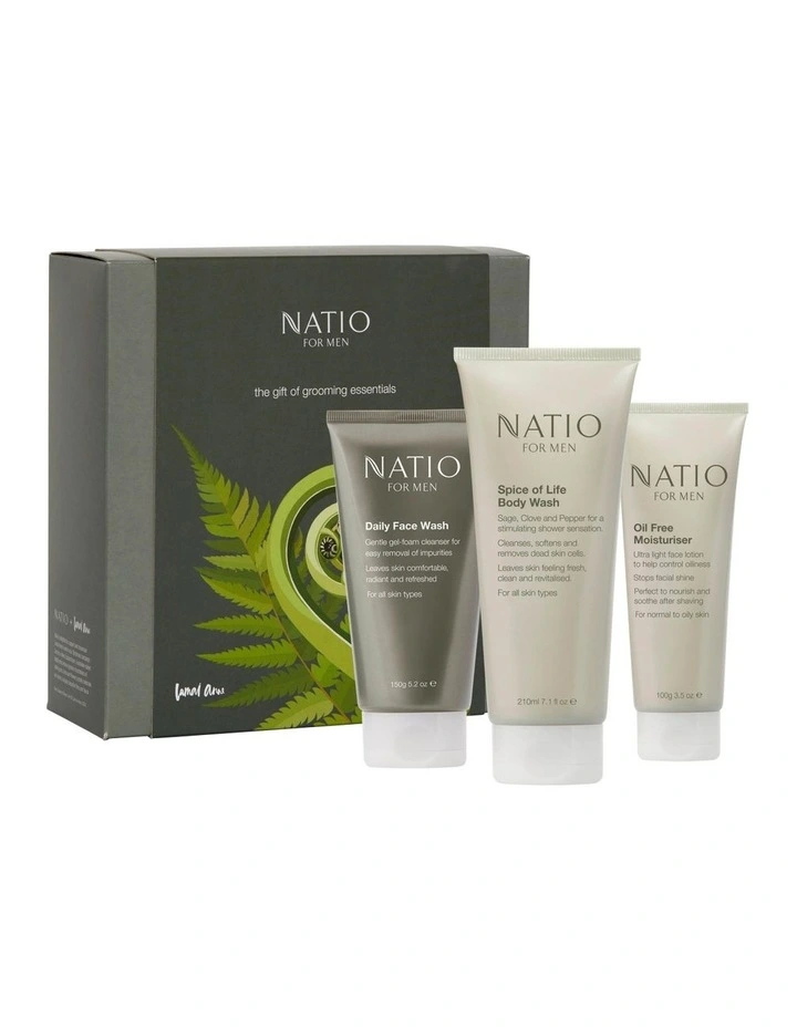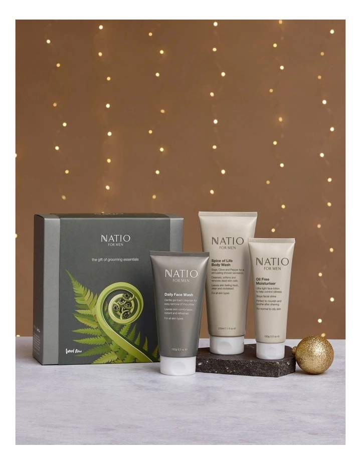 River Rock gift set includes a Natio for Men Daily Face Wash 150g, Spice of Life Body Wash 210ml and Oil Free Moisturiser 100g, presented in a Natio gift box featuring native flora artwork by Australian digital artist, Lamai Anne.Β Β