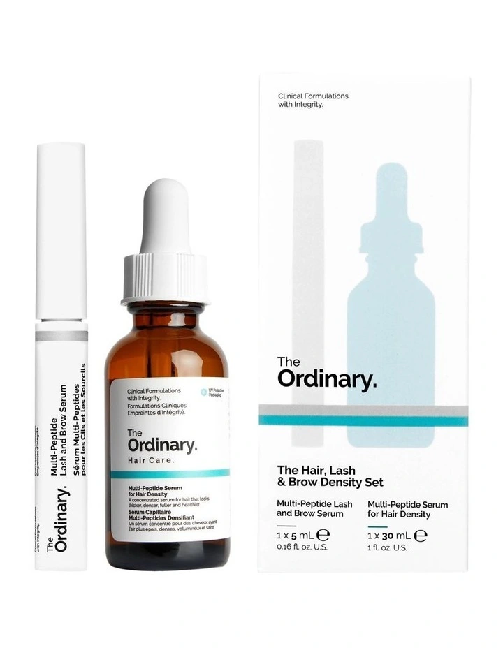 Product Ingredients: The Hair, Lash & Brow Density Set includes:Multi-Peptide Lash and Brow Serum – 5mlAqua, Glycerin, Butylene Glycol, Myristoyl Pentapeptide-17, Biotinoyl Tripeptide-1, Oligopeptide-2, Acetyl Tetrapeptide-3, Caffeine, Panthenol, Arginine, Glycine, Glycoproteins, Larix Europaea Wood Extract, Trifolium Pratense Flower Extract, Camellia Sinensis Leaf Extract, Dextran, Maltodextrin, Zinc Chloride, Hydroxyethylcellulose, Xanthan Gum, Trisodium Ethylenediamine Disuccinate, Polysorbate 20, Sodium Metabisulfite, Caprylyl Glycol, 1,2-Hexanediol, Sodium Benzoate, Benzoic Acid, Ethylhexylglycerin, Phenoxyethanol, Chlorphenesin.Multi-Peptide Serum for Hair Density – 30mlAqua (Water), Propanediol, Butylene Glycol, Glycerin, Caffeine, Biotinoyl Tripeptide-1, Acetyl Tetrapeptide-3, Larix Europaea Wood Extract, Pisum Sativum Extract, Scutellaria Baicalensis Root Extract, Triticum Vulgare Germ Extract, Glycine Soja Germ Extract, Trifolium Pratense Flower Extract, Camellia Sinensis Leaf Extract, Apigenin, Oleanolic Acid, Arginine, Glycine, Calcium Gluconate, Zinc Chloride, Lactic Acid, Gluconolactone, Dextran, Maltodextrin, Hydroxyethylcellulose, Xanthan Gum, Pentylene Glycol, Dimethyl Isosorbide, Polysorbate 20, PPG-26-Buteth-26, PEG-40 Hydrogenated Castor Oil, Trisodium Ethylenediamine Disuccinate, Sodium Metabisulfite, Sodium Benzoate, Phenoxyethanol, Chlorphenesin.Our formulations are updated from time to time as part of our commitment to innovation. As such, the ingredient list shown here may vary from the box of the product depending on time and region of purchase.