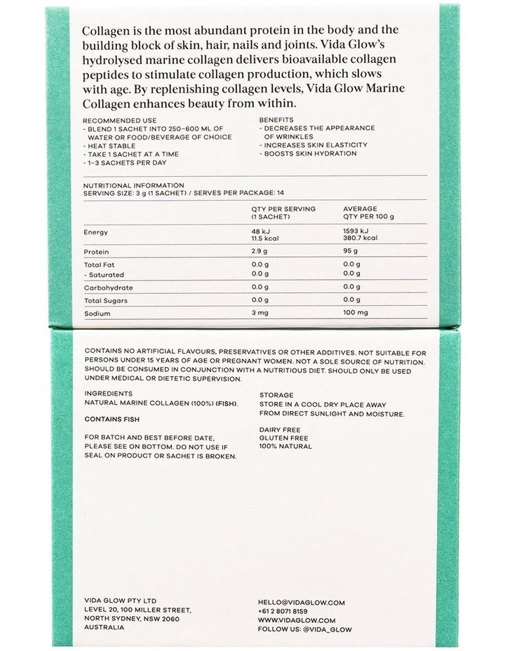 Product Ingredients: Natural marine collagen Contains Fish