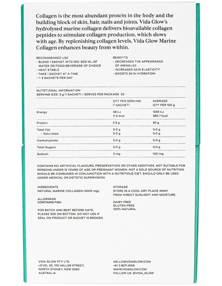 Product Ingredients: Natural marine collagen*Contains no artificial flavours, preservatives or other additivesIndependently tested for quality and safetyContains fishFree from gluten, dairy, eggs, nuts and soy