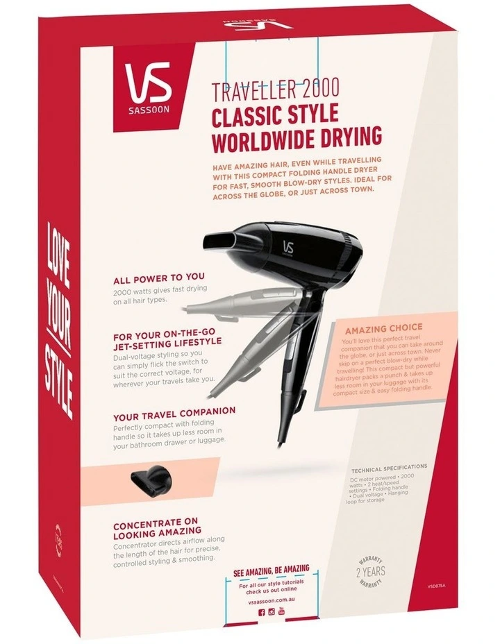 Have amazing hair, even while travelling with this compact folding handle dryer for fast, smooth blow-dry styles. Ideal for across the globe, or just across town.